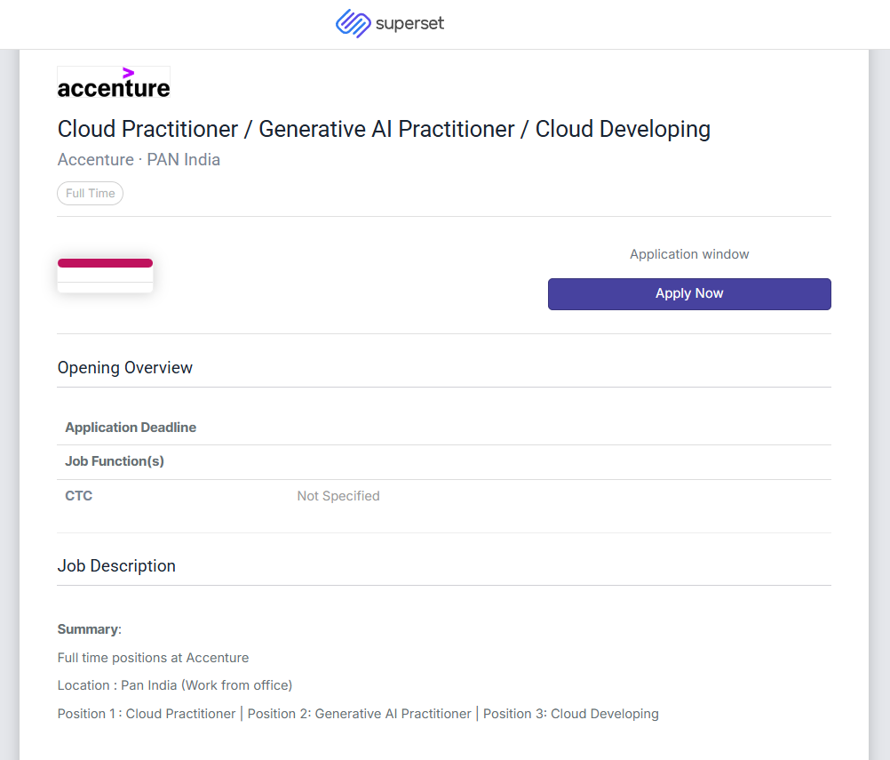 The candidates who are interested can apply via their formal Accenture Careers portal as well as through Superset. Resumes should be updated that include technical certifications, educational details, as well as relevant project experiences. Candidates who meet the required specifications and criteria for accreditation are selected for the next phase of interviews and evaluation.