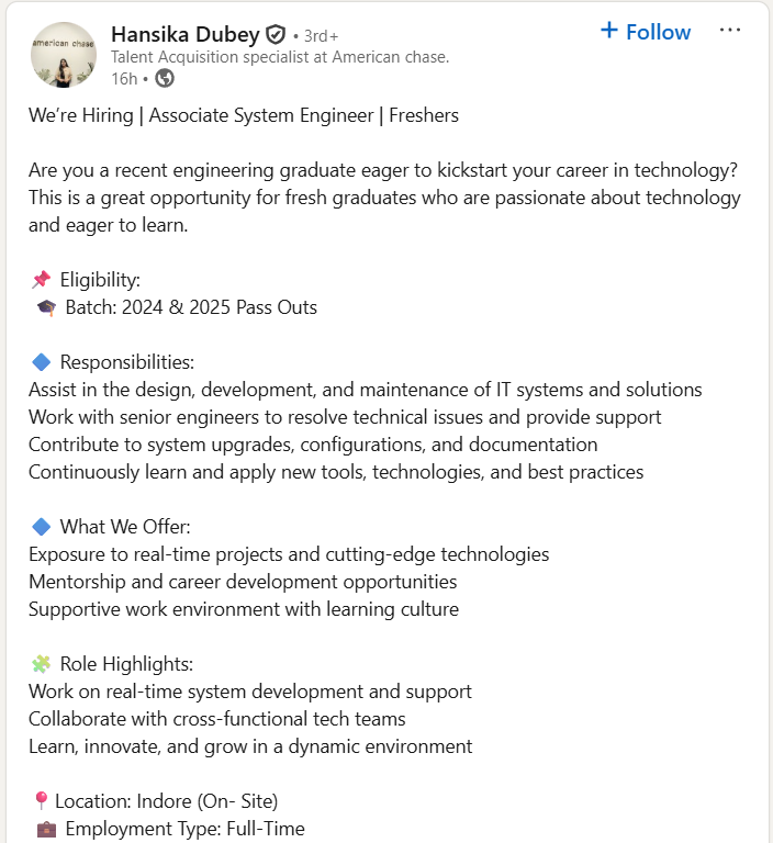 American Chase Off Campus Hiring: The Associate System Engineer job in Indore offers a great opportunity for recent engineers who are looking for new IT positions in Indore. Candidates who are enthusiastic about establishing careers in support of IT and technological solutions can apply today.