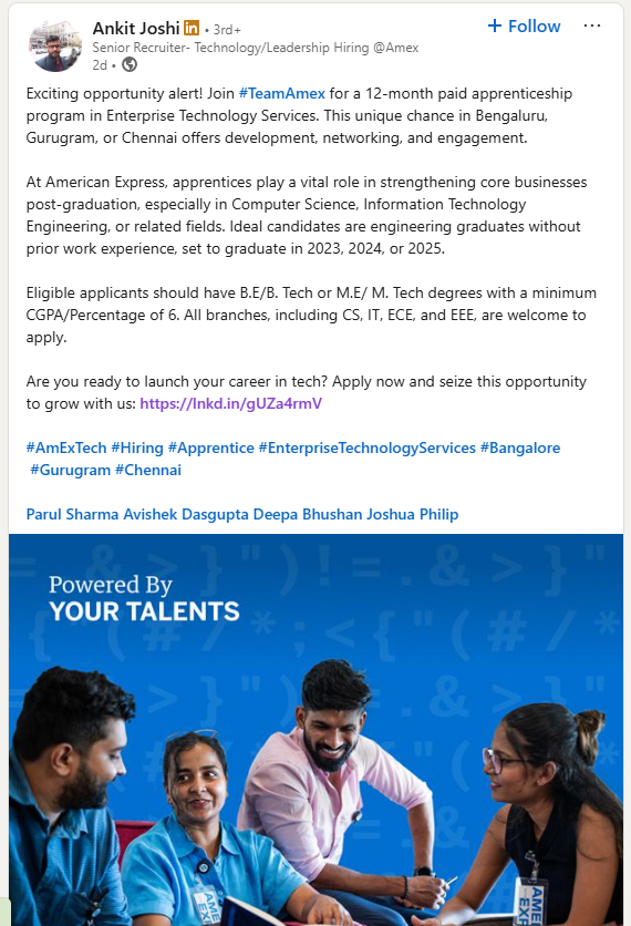 American Express Off Campus Drive: Start your journey towards a lucrative career in the field of technology with an outstanding 12-month apprenticeship program provided by American Express, a global market leader in financial services.