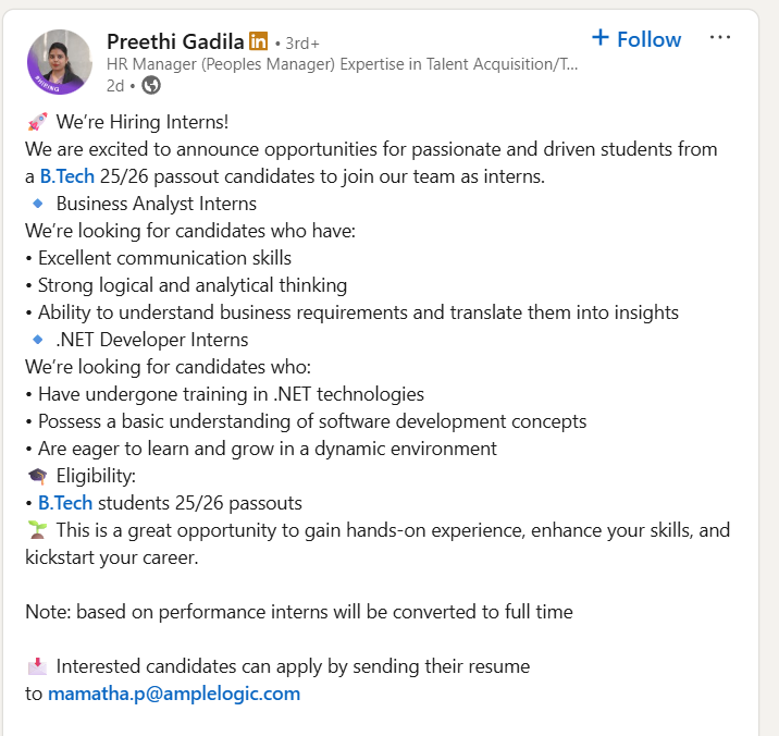 Amplelogic Hiring Drive: Are you a B.Tech 2025, 2026 student seeking job opportunities for freshers in the IT industry? This is an excellent opportunity to gain practical experience in the industry and lay the base for a career in business and technology analysis.