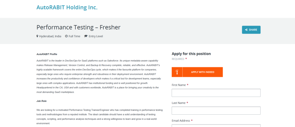 AutoRABIT New Hiring: AutoRABIT is seeking Performance Testing Engineers (Freshers) to join its expanding QA as well as DevOps Team in Hyderabad. This is a fantastic opportunity for recent graduates educated in JMeter, performance testing and other testing tools who wish to work in large-scale high-performance systems.