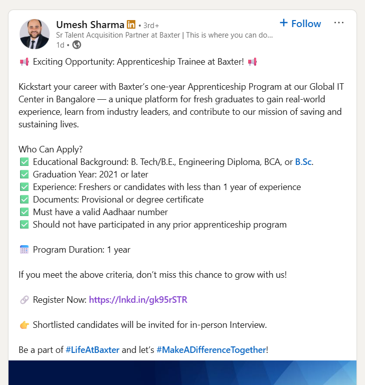 Baxter Off Campus Hiring – Apprenticeship Trainee Role