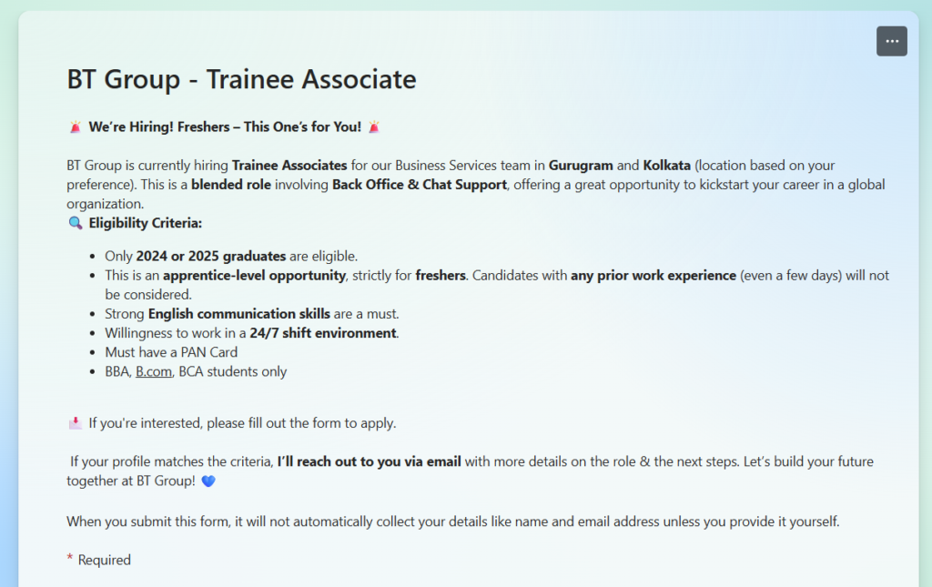 It is the trainee associate position at BT is a great entry-level job for fresh BBA/ B.Com or BCA graduates who are looking to gain work experience in a highly competitive business setting.