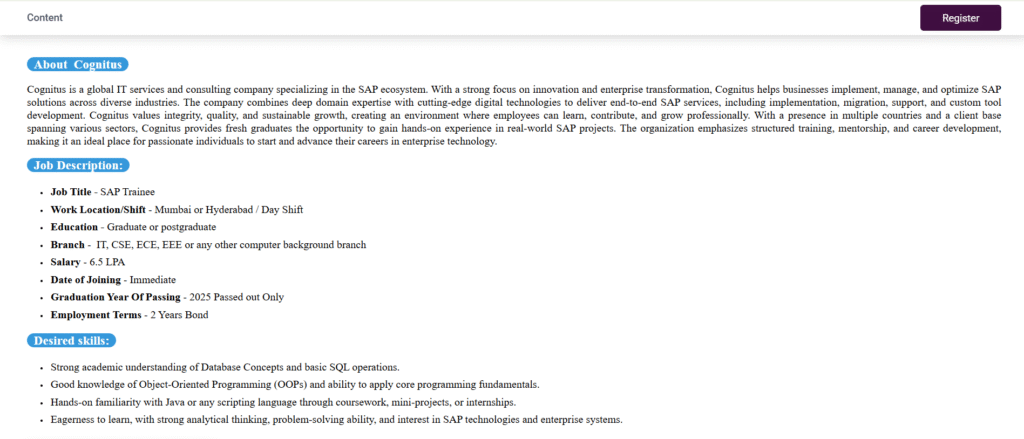Cognitus Off-Campus Drive: Cognitus, a leading global IT services and consulting company, provides thrilling opportunities for future technologists to pursue fulfilling careers SAP ecosystem. The company is known for transforming businesses with digital technology. Cognitus empowers organisations to improve their operations by utilising innovative SAP solutions. The firm’s commitment to excellence, honesty and growth in the profession makes it an ideal destination for those who are eager to learn about, influence change, and impact enterprise technology.