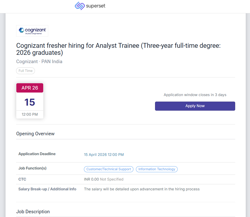 Cognizant Big Hiring Drive: Cognizant welcomes 2026 batch freshers to apply for Analyst Trainee roles that align with IT and Intelligent”Smart Operations”, Multicloud and Digital Workplace Services. The roles require flexibility in shifts, a focus on clients, and a willingness to work in 24/7 environments. After joining, perks include allowances for night shifts along with cab facilities, as well as rewards for performance.