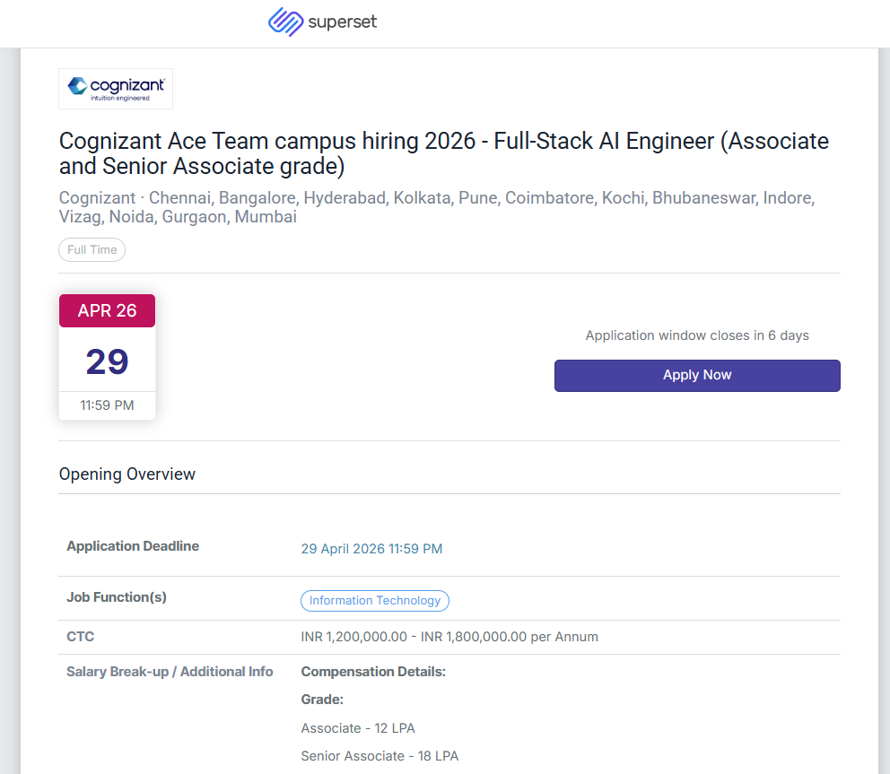 Cognizant Hiring Drive: Cognizant Ace Team is an elite engineering program specifically designed to attract the best AI talent. The selected candidates are involved in real-world business projects that utilise Artificial Intelligence(AI), Machine Learning, and Full-Stack Development technologies. The focus of the job is on creating Artificial Intelligence-powered apps, RAG pipelines, and LLM-based applications.