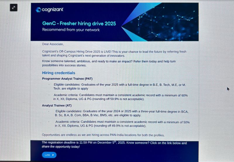Cognizant Latest Hiring Drive Referrals 1 – Apply Link