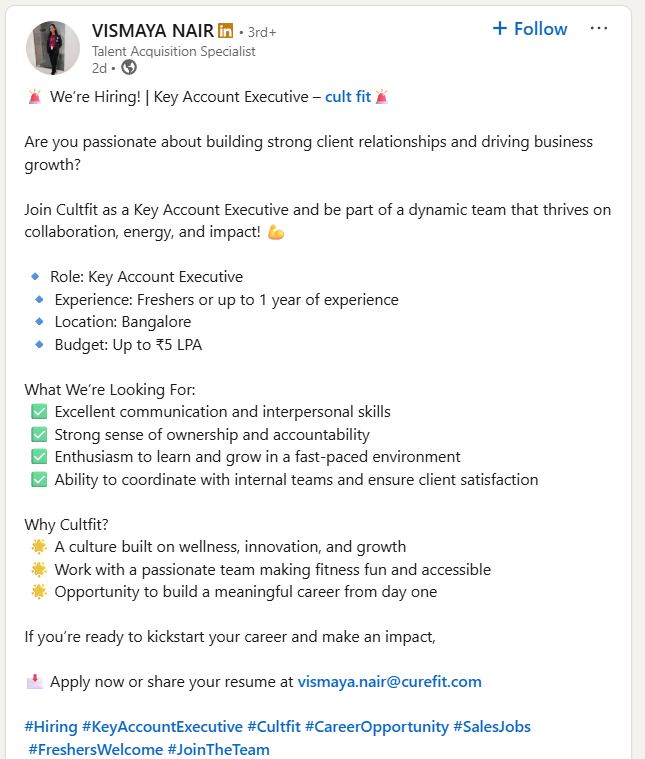 - Job Title: Key Account Executive – Cultfit | Bangalore