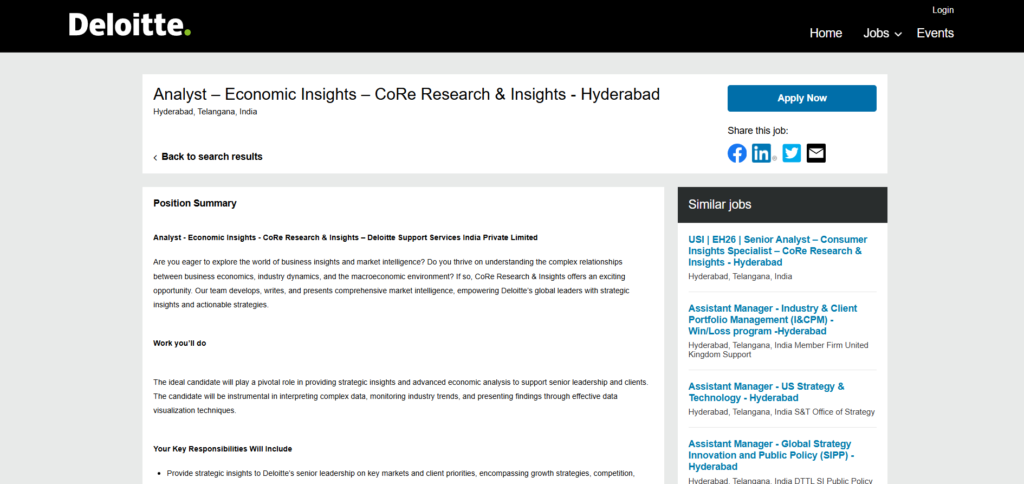Deloitte New Drive: Deloitte solicits applications for a Research Analyst post in Hyderabad. This full-time office position will be suited to those with a master’s level in economics who are looking to develop expertise in macroeconomic analysis, econometrics, as well as public policy research and the generation of consultative insights. There is no previous experience needed for this job is perfect for students looking to get entry-level economics positions in Hyderabad.