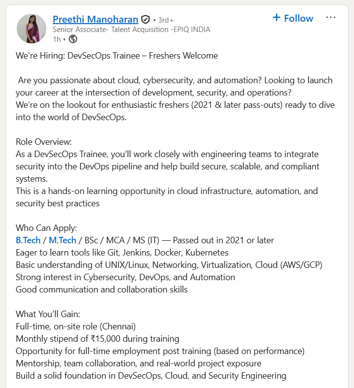 Epiq India Off Campus Hiring 2025: Learn how to get started with DevSecOps by pursuing an exciting job specifically designed for students fascinated by security, cloud technology, and automation. This position provides practical experience in the integration of security in DevOps pipelines and in establishing effective systems that scale using the latest tools. It is ideal for those looking to know more about the intricate interplay between security, development and operation. This job provides assistance, practical experience and the chance of moving to a full-time career.