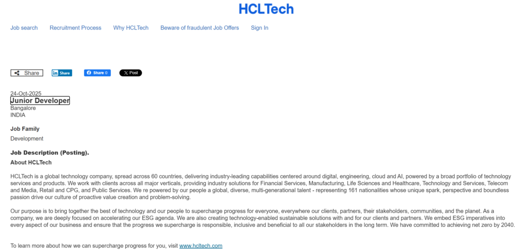 HCL Off Campus Hiring: HCL Technologies Limited, one of India’s most reliable IT service providers, is looking to hire highly motivated and skilled applicants for the position of Junior Developer within their Bengaluru headquarters. This job is perfect for people who are enthusiastic about software development, programming, as well as troubleshooting and coding. They want to begin or advance their careers in a technologically advanced environment. The position of Junior Developer offers a comprehensive education experience and direct involvement in projects as well as exposure to the most recent tools for development within a lively team setting.
