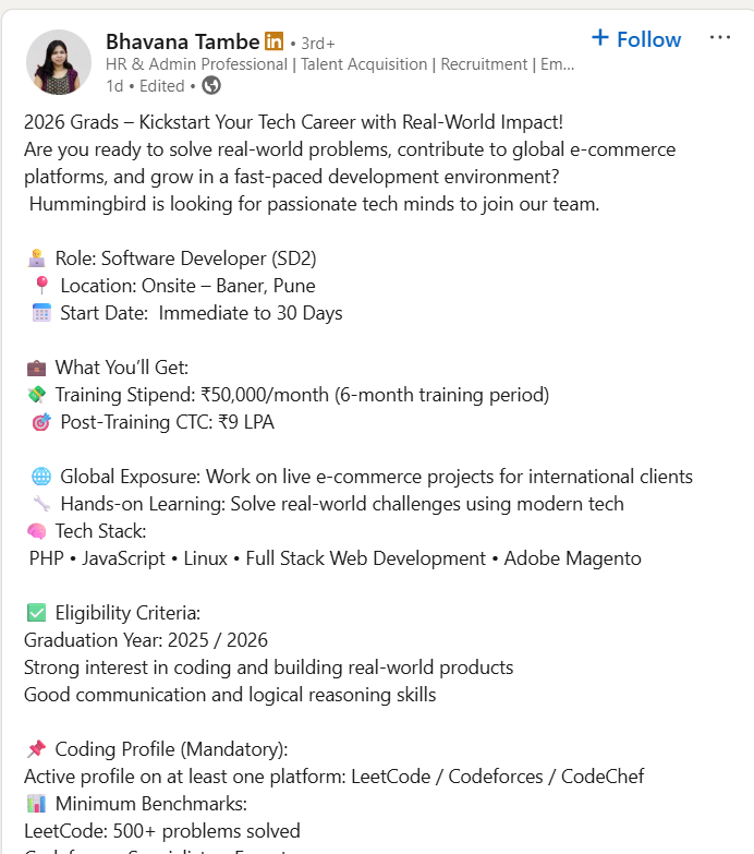 Hummingbird Off Campus Hiring: Start your career in high-growth technology with hands-on experiences working with full-stack web development and e-commerce. It is a Software Developer (SD2) position that provides immediate impact on real-time live, international projects.