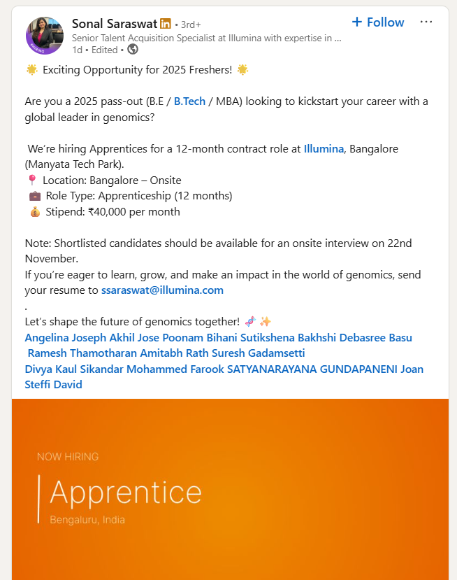 Illumina Off Campus Hiring: Starting a career with an international biotechnology company will enhance your professional career and provide the opportunity for future success. illumina is a world-class pioneer in the field of genomics, has opened applications for a thrilling 12-month Apprenticeship Program that is based at Manyata Tech Park, Bangalore. This job opportunity is specially designed for recent graduates of 2025 who are eager to begin their career in a stimulating and research-driven environment.