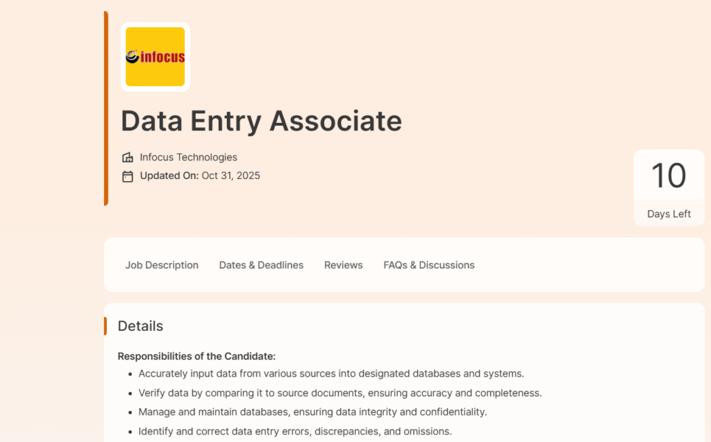 Infocus Technologies Off Campus Hiring: The Data Entry Associate job at Infocus Technologies is a fantastic chance for professionals who are meticulous to begin a new career in operations and management of data. The job focuses on data integrity, confidentiality and the proper electronic record-keeping. This position offers the convenience of working remotely, while working for an organisation that is driven by accuracy, integrity and efficiency.