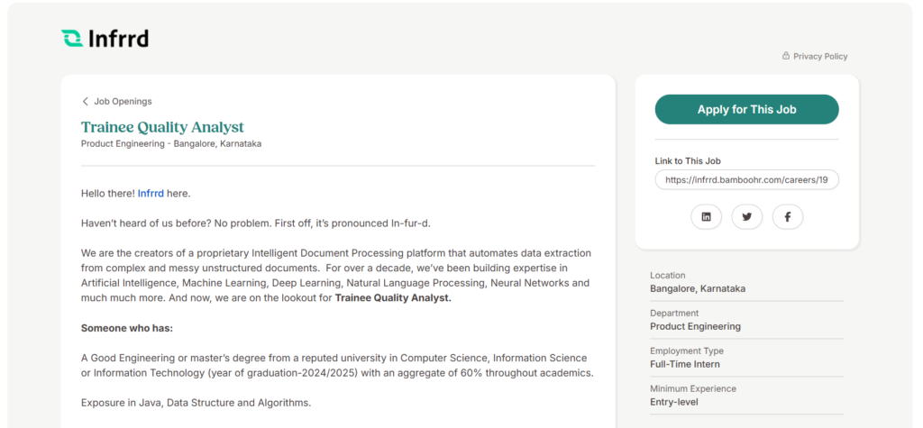 Infrrd Off Campus Hiring: An acclaimed AI-driven engineering firm with its headquarters in Bangalore is looking for enthusiastic graduates for the role of Trainee Quality Analyst. The company specialises in Intelligent Document Processing (IDP), which utilises advanced Artificial Intelligence and Machine Learning technologies to help automate the extraction of data from unstructured and complex documents. With more than 10 years of development with Deep Learning, Natural Language Processing, as well as Neural Network systems, this position offers the perfect opportunity to begin an exciting career in the field of software quality and testing in an ever-changing AI ecosystem.