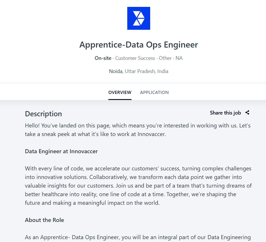 Innovaccer New Hiring Drive: A fantastic opportunity is now available for a passionate Apprentice Data Ops Engineer to join an innovative and fast-paced Data Engineering team. This job requires practical experience in the process of changing and managing data from healthcare and reports. It also involves developing analytical reports and assisting initiatives that aim to improve the health of patients as well as cost-effectiveness. This position is ideal for people who are looking to establish a career in data operations, as well as analytics and engineering, in a constantly changing working environment.