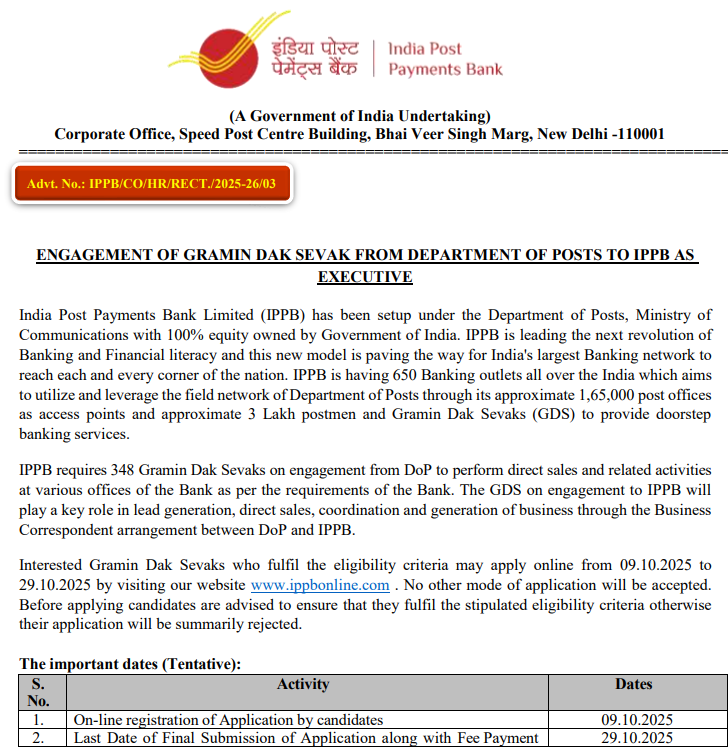 IPPB Off-Campus Recruitment: India Post Payments Bank Limited (IPPB) was established as a part of the Department of Posts, Ministry of Communications, and is completely operated by the Government of India. It invites applicants from eligible Gramin Dak Sevaks (GDS) for 348 executive positions. This job opportunity draws on the huge network of more than 160,000 post offices, and the 3000 postmen, as well as GDS, to provide banking-on-demand services, promoting financial integration across India. Applications are accepted until the 9th of October, 2025, through the 30th of October, 2025, only through www.ippbonline.com. Here are the specifics of this amazing job opportunity.