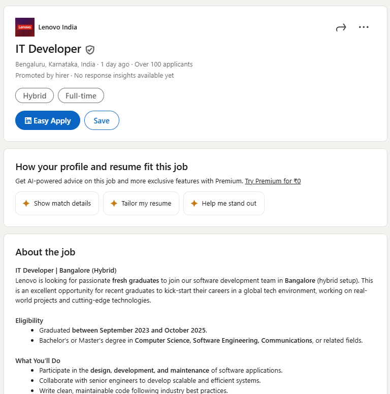 Lenovo Off Campus Hiring – IT Developer – Bangalore (Hybrid)