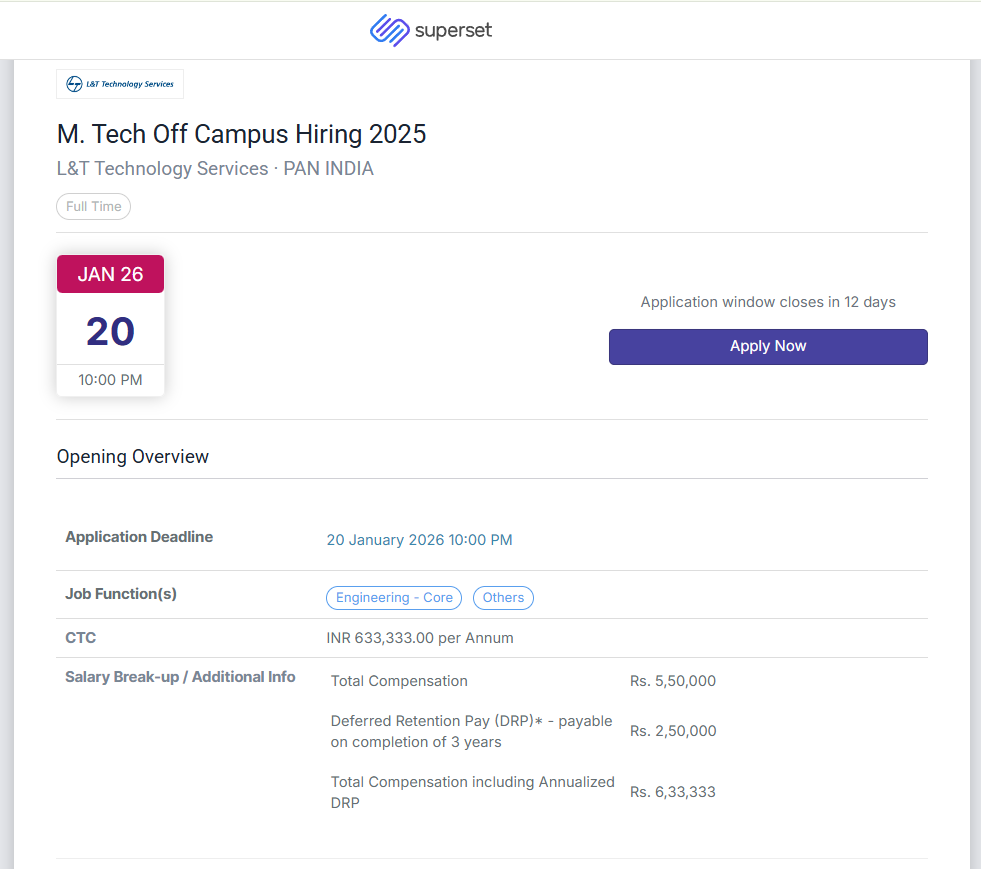 L&T New Big Hiring Drive: L&T Technology Services has opened national recruitment of M. Tech graduates under its Off-Campus Hiring 2025 initiative. This job opportunity provides the possibility of a career in key engineering areas across India, offering hands-on experiences in design, technical development, research, and product engineering. The company is renowned for providing structured professional development and exposure to the latest technologies, as well as an ingenious setting that allows for the highest level of engineering.