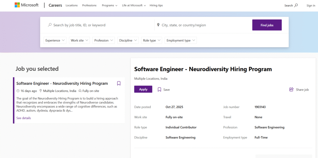 Microsoft New Big Hiring Drive: A job in software engineering gives an amazing opportunity to develop solutions that enable innovation, boost the user experience, and transform digital landscapes. The Software Engineer job is part of the Neurodiversity Hiring Program is designed to provide inclusive opportunities for professionals with talent across India with distinct thinking patterns, a creative mind and a love for technology.