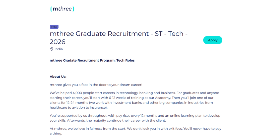 Apply today to apply for Mthree graduate recruitment ST Tech 2026 India to gain access to pay-for-training as well as competitive salaries for freshers and direct placement possibilities for positions in the field of software engineering.