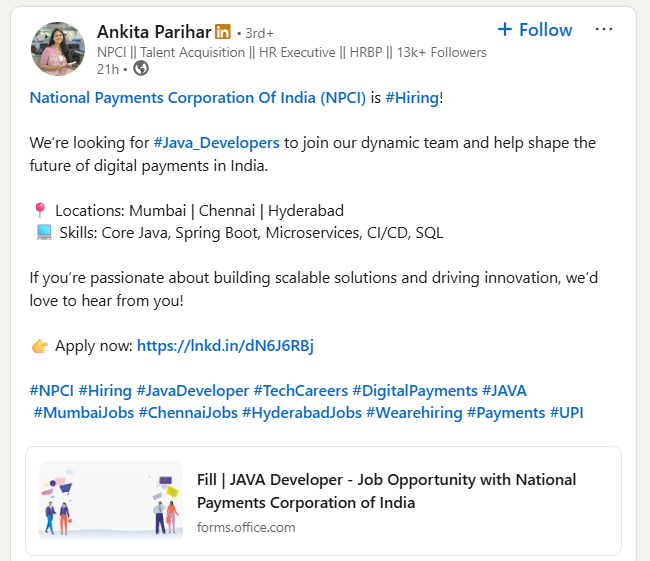 NCPI New Hiring Drive: National Payments Corporation of India (NPCI) invites Java Developers to be part of the NPCI’s mission to transform the payment system in India to be electronic. This presents a chance to launch massive initiatives that touch millions of customers every day. This job is perfect for candidates who’re enthusiastic about developing back-end systems, advanced technology and solid and secure financial technologies.