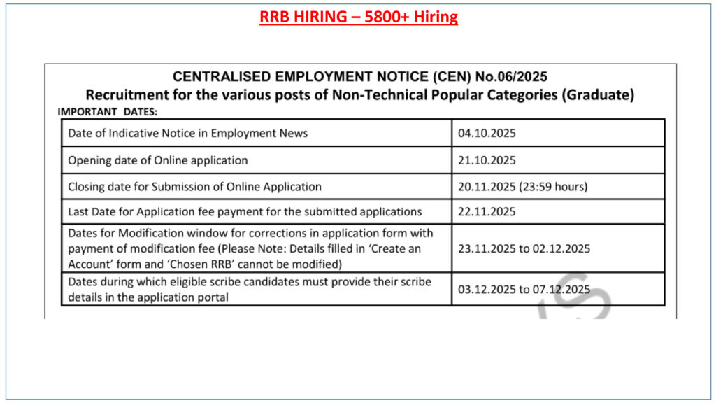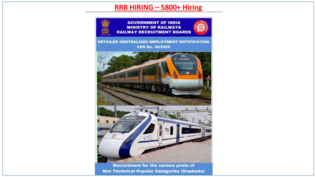 RRB Off Campus Recruitment: The Railway Recruitment Board (RRB) has officially announced the RRB Graduate Level NTPC Notification of Recruitment 2025 (CEN 06/2025) on 20 October 2025 for the 5810 vacancy positions across different Indian Railway zones. Online application for the positions opened the October 21 of 2025, and will be available through November 20 2025.