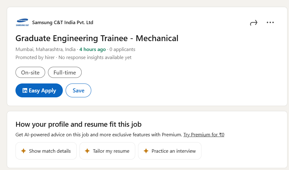 Samsung Hiring Drive: An industry-leading infrastructure and engineering organisation is looking for dynamic and skilled Mechanical Engineering graduates to join as a Graduate Engineer Trainee (Mechanical) at its Mumbai BKC office. This full-time job offers unparalleled experience in real-world design engineering and project planning, and constructionability review processes for huge-scale engineering tasks. This job is ideal for fresh graduates who are passionate about the mechanical aspect of design and construction, safety and multidisciplinary projects.