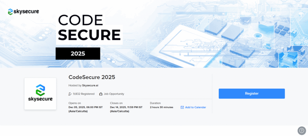 The registration to participate in CodeSecure 2025 is now open on Skysecure.ai’s official page for the event. The applicants must sign up with basic personal information and then confirm their participation before the date of opening. The coding platform will open once the contest begins at 6:00 pm IST on the 5th of December 2025.