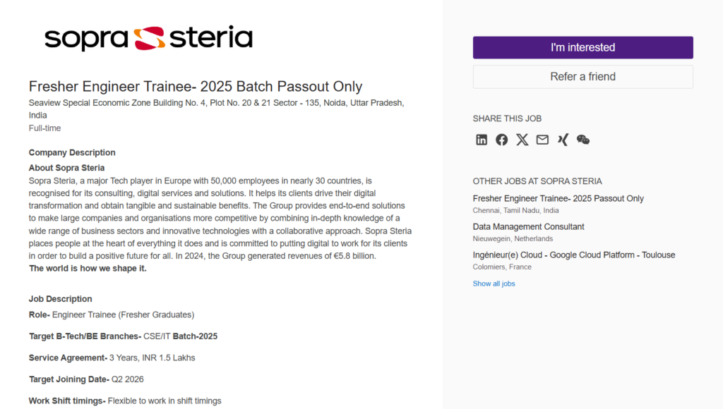 Students who are interested in the 2025 batch of the CSE/IT graduate program who satisfy the criteria can search for application details via the official Sopra Steria career channels or other suitable websites that offer this job opening. Be prepared to be selected based on technical aspects in addition to ability and aptitude.
