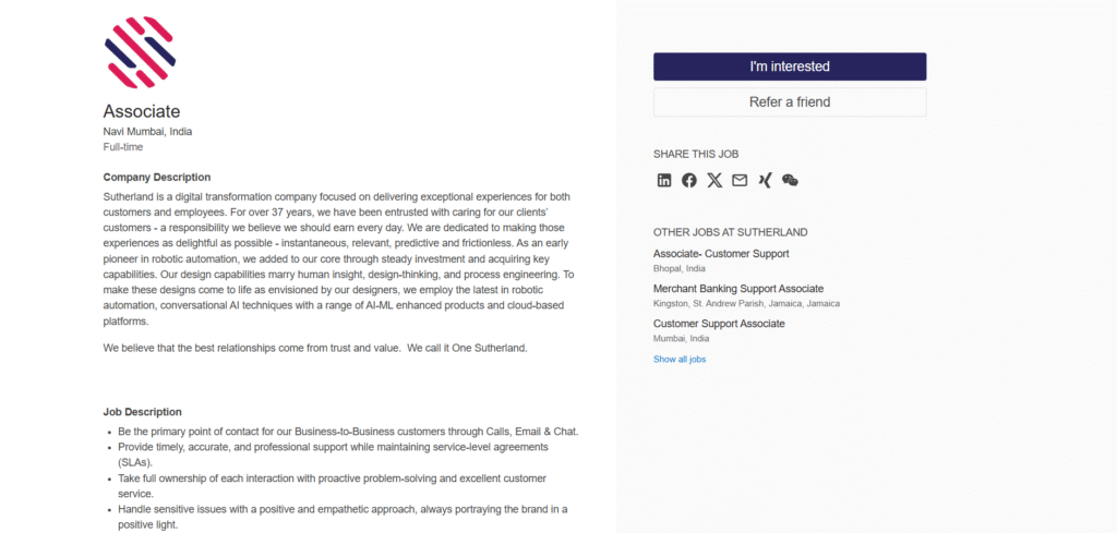 Sutherland New Hiring Drive: A rewarding career path is accessible to those who are driven and eager to begin or grow in the area of service to customers. The Associate A job in Navi Mumbai is an exciting work environment that allows exposure to business-to-business (B2B) interactions and the chance to build professional capabilities while supporting customers via various channels of communication, such as email, phone calls, and live chat.