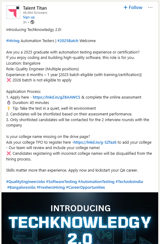 Talent Titan New Off Campus Hiring: The Techknowledge 2.0 team is searching to recruit passionate Automation Testing testers of the 2025 batch to work in an exciting environment focused on the development of high-quality applications. This job is perfect for individuals who are adept at designing and automation testing frameworks, as well as making sure that software is performing in a top-quality manner.