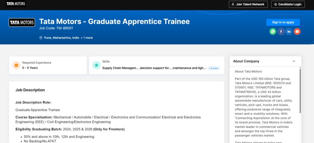 Tata Motors Off Campus Hiring: Looking for a fast-growing engineering job opportunity for young engineers from India? Tata Motors has announced a fantastic opportunity for the position of a Graduate Apprentice Trainee. This is an excellent starting point for those looking to pursue jobs in manufacturing, automobile engineering, and supply chain management within India.