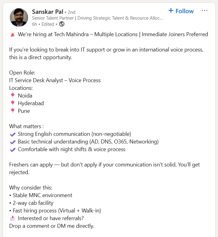 Tech Mahindra Hiring Drive: Tech Mahindra announces openings for IT Service Desk Analyst Voice Process positions across various locations. People looking for IT support positions, voice process BPO positions, or opportunities in international voice processing are eligible for consideration for full-time jobs, with a preference for immediate entry.
