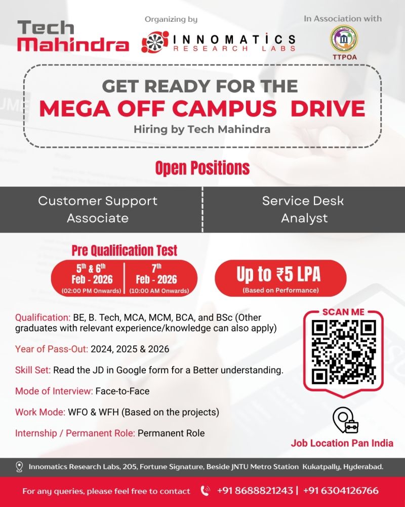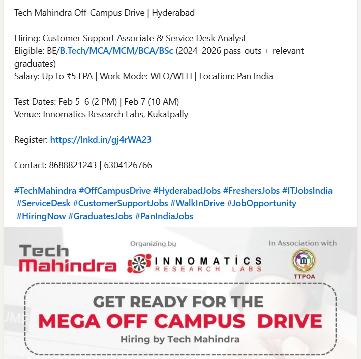 Tech Mahindra Mega Off Campus Drive: Tech Mahindra launches off-campus recruitment campaign in Hyderabad for new graduates. There are a variety of positions open. Customer Support Associate and Service Desk Analyst. Opportunities exist for BE/B. Tech, MCA, MCM, BCA, or BSc holders from batches 2024-2026, and relevant graduates from across India.