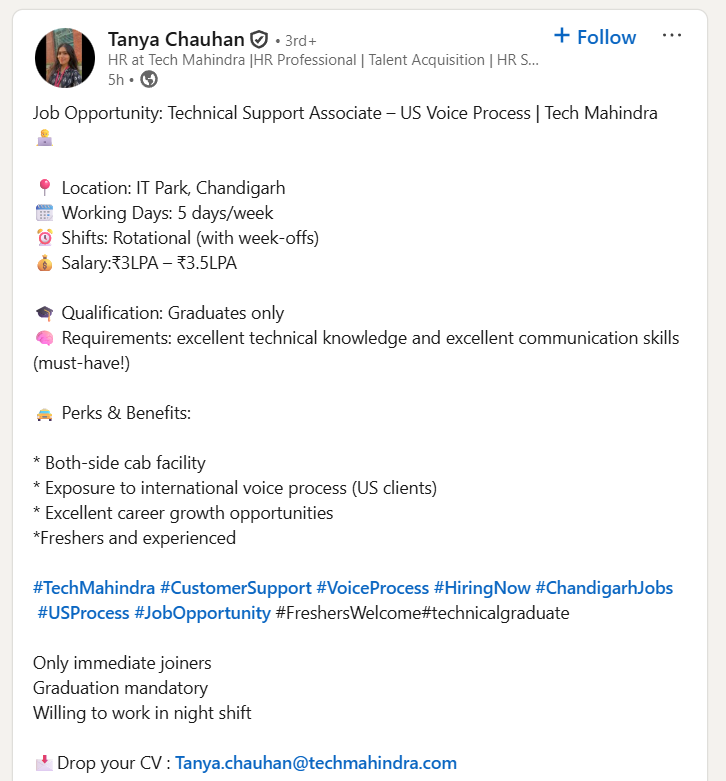 Eligible applicants can share their latest resume directly at Tanya.chauhan@techmahindra.com to participate in the recruitment process. Candidates who are shortlisted will be contacted to arrange for additional interview rounds and technical assessments.