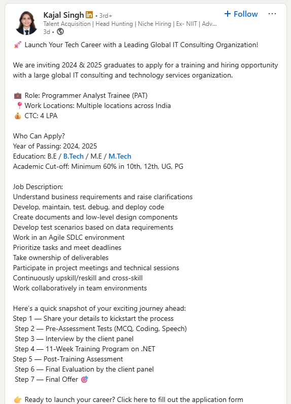 upGrad New Hiring Drive: An amazing opportunity is open for graduates between 2024 and 2025 who wish to enter the tech industry. A well-known IT technology and consultancy company is offering a Programmer Analyst Trainee (PAT) position, along with the position, an Employment and training program designed specifically for those in their initial years and keen to get started on a technology career.