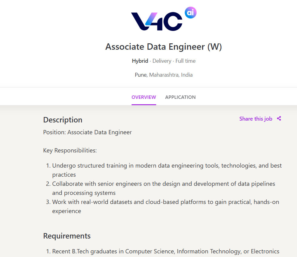 V4C AI Hiring Drive: A fantastic chance for students of engineering who are just beginning to establish a solid foundation on the subject of data engineering. This job is centred around practical training in addition to hands-on experience working with the latest software for data and actual applications within the context of a team.