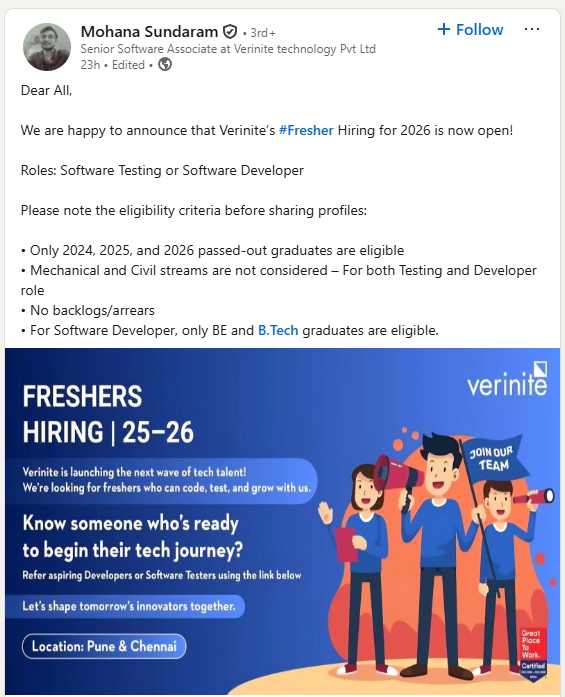 Verinite Off Campus Drive: Fantastic chance for recent graduates to start their IT career path with Verinite! Verinite’s 2026 fresher Hiring Drive is now open and soliciting talented applicants to apply as Software Developers or Software Testers. This job seeks to recruit enthusiastic graduates who are eager to explore, develop and participate in exciting technology-related projects.