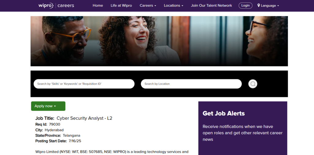 Wipro New Hiring: A renowned global information technology consultancy and business process services company is seeking a highly skilled cybersecurity analyst to join its dynamic team in Hyderabad. This job offers an exciting chance for those with a minimum of 1-3 years’ experience to help protect important systems and information in an ever-changing, technology-driven business. Anyone interested in security, risk management, and safeguarding organisational assets is invited to apply.