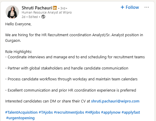 Interested candidates can share their updated CV at shruti.pachauri@wipro.com, mentioning “HR Recruitment Coordination Analyst – Gurgaon” in the subject line.