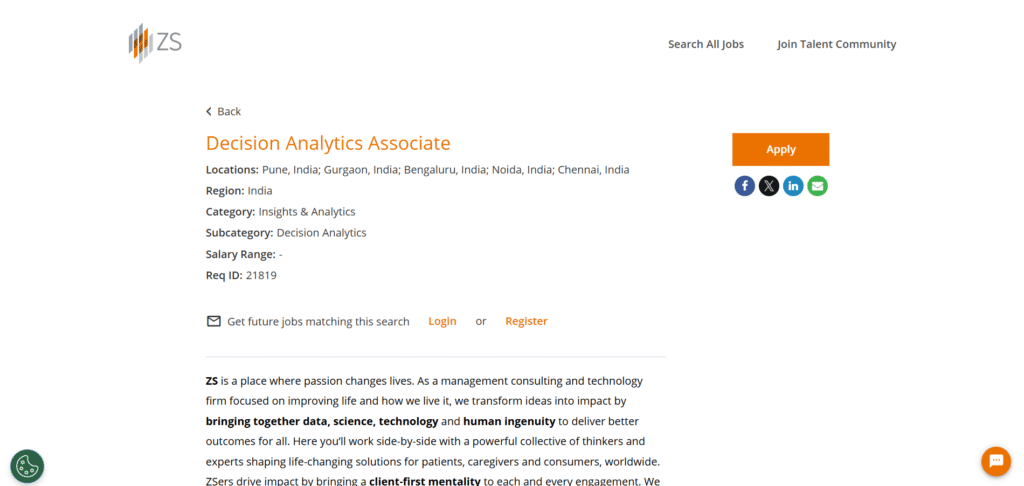 ZS Latest Hiring: An internationally renowned consulting and analytics firm is seeking applications for the job in the position of Decision Analytics Associate. This position offers the chance to use data-driven decision-making as well as advanced analytical models to help deal with complex business challenges for international clients. The job is available across all major Indian areas that include Pune, Gurgaon, Bengaluru, Noida, and Chennai.